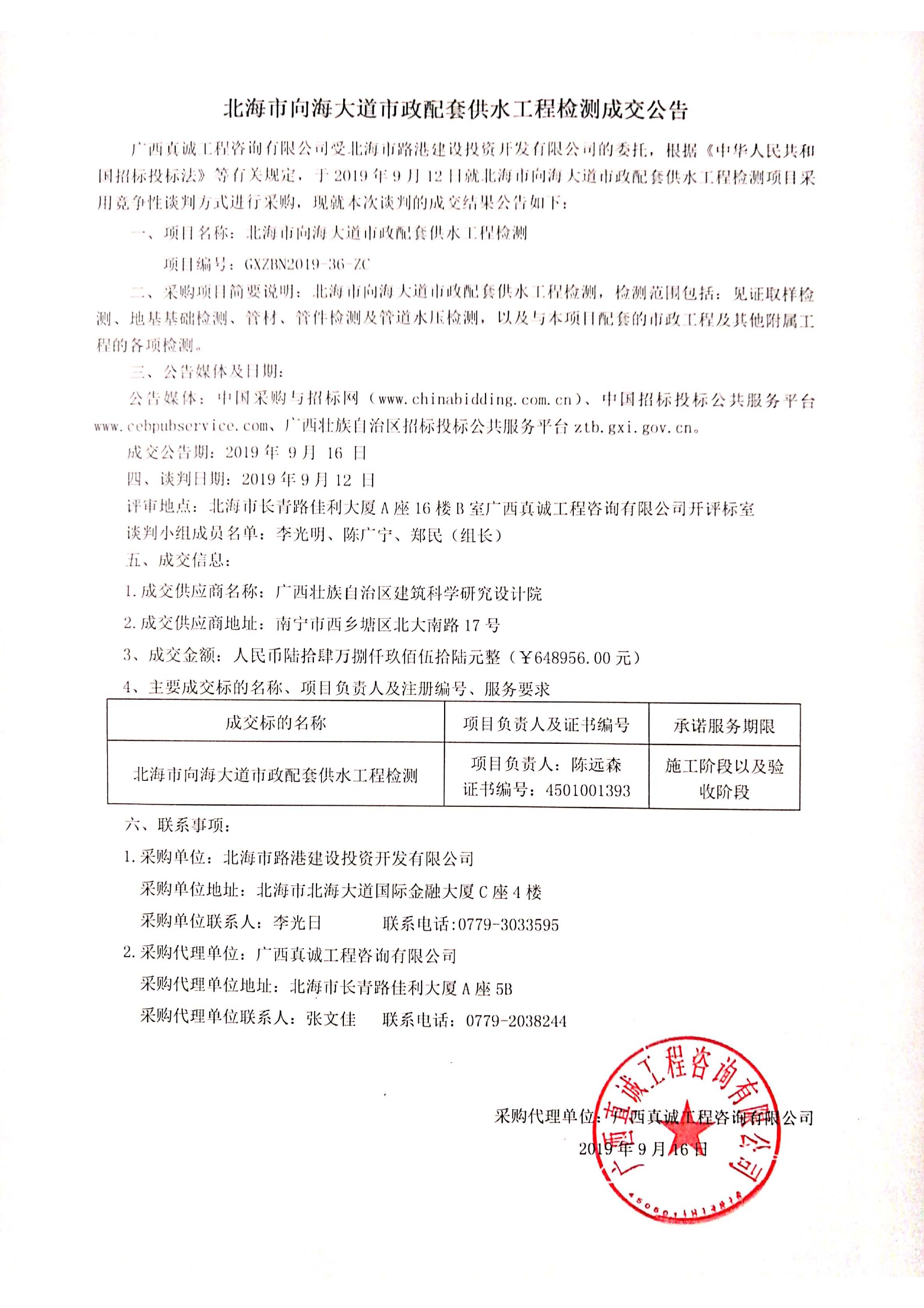 北海市向海大道市政配套供水工程檢測競爭性談判公告